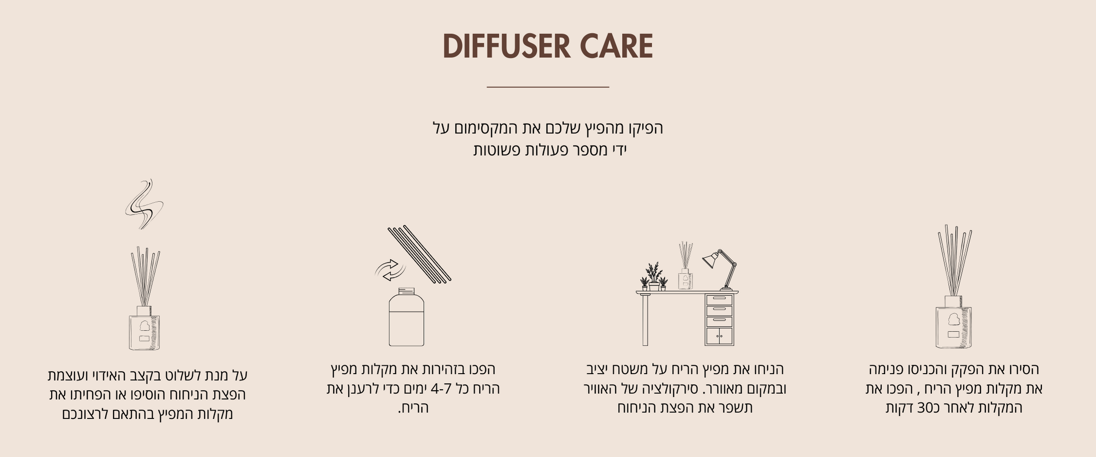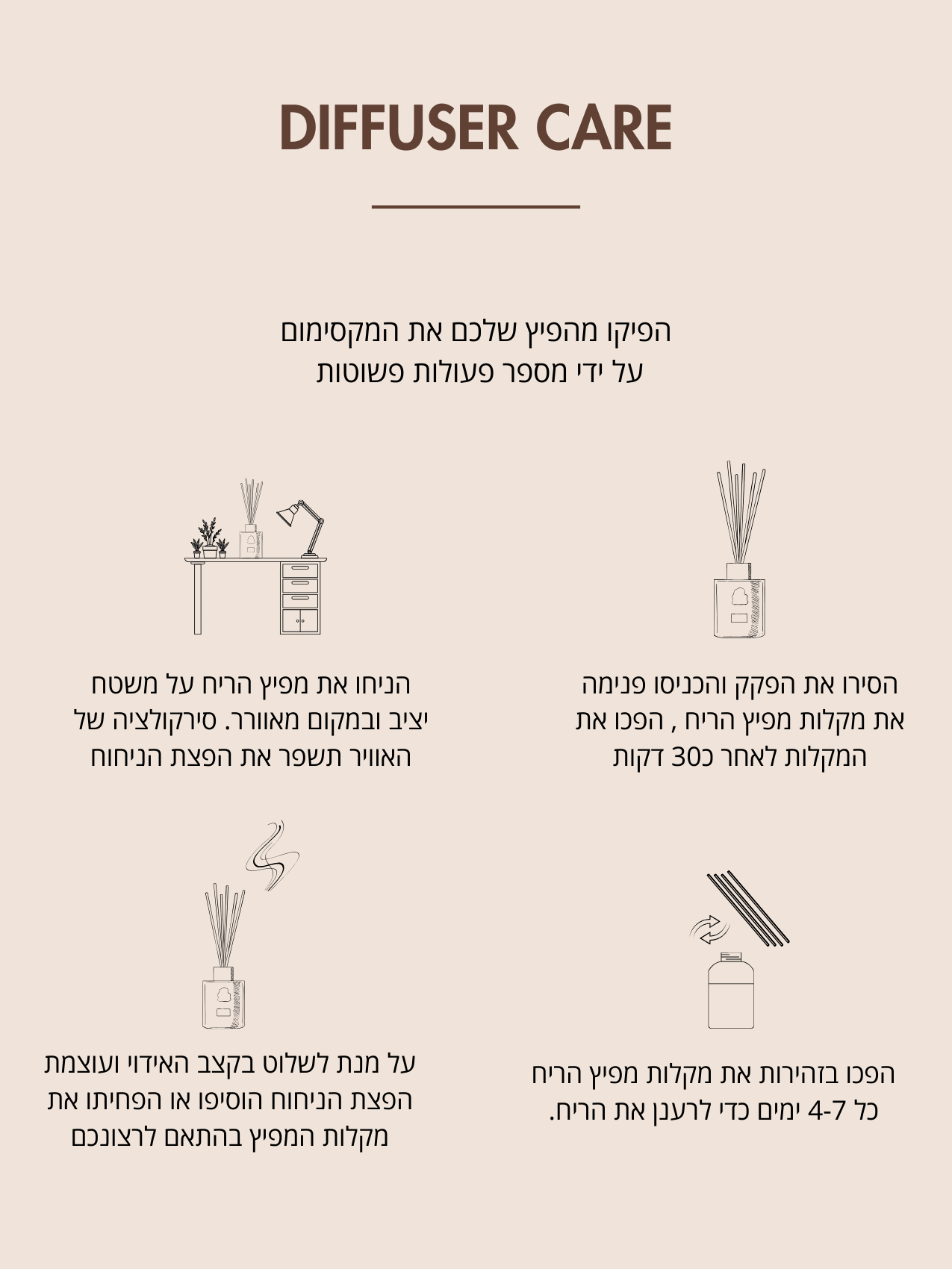 כדי שתוכלי להינות מהמפיץ והניחוח שלו בצורה הטובה ביותר מומלץ מאוד לקרוא את המדריך הקצר לטיפול במפיצי ריח שהכנו לך